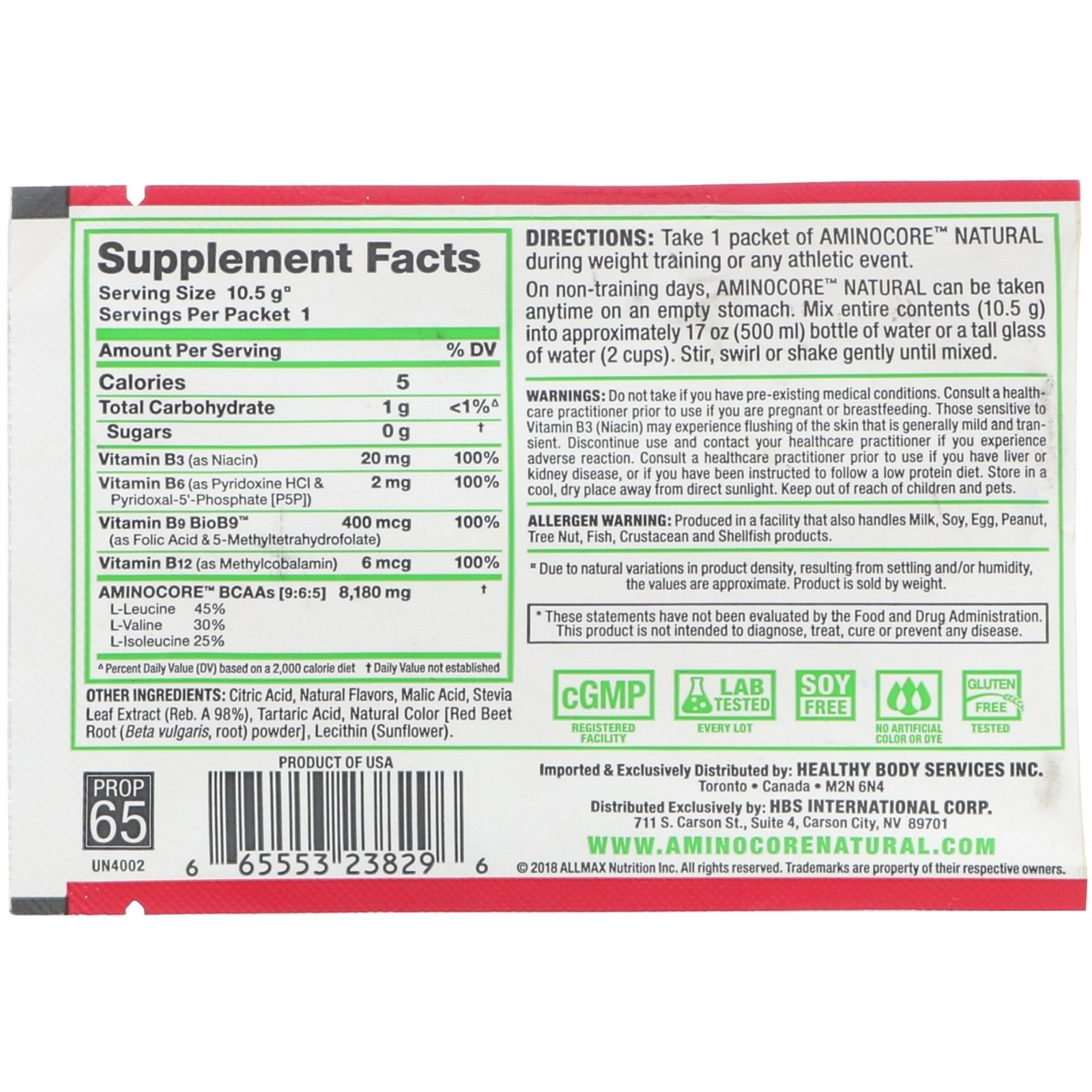 Принимайте 1 упаковку Aminocore Natural во время силовых тренировок. В дни без тренировок Aminocore Natural можно принимать в любое время натощак. Смешайте все содержимое (10,5 г) с водой объемом около 500 мл и хорошо встряхните.